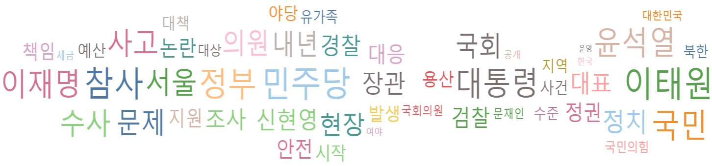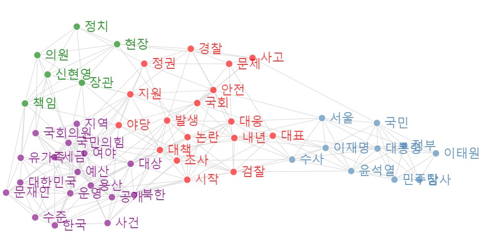 국내 뉴스, SNS, 커뮤니티 등에서 수집된 빅데이터를 '이태원' 키워드를 중심으로 재구성해보면 참사를 직접적으로 언급하는 키워드 그룹(하늘색), 정부의 대응과 안전 부실에 대한 논란(붉은색), 신현영 의원 관련 키워드 그룹(녹색), 그 외 유가족에 대한 관련 키워드(보라색)의 4개 그룹으로 구분된다. 키워드로 구성된 네트워크를 분석하는 기법인 관계 중심성(Betweenness centrality)을 통해 4개의 그룹으로 구분이 됐고, 각각은 특정 의미를 가진 키워드의 그룹으로 나뉜다.