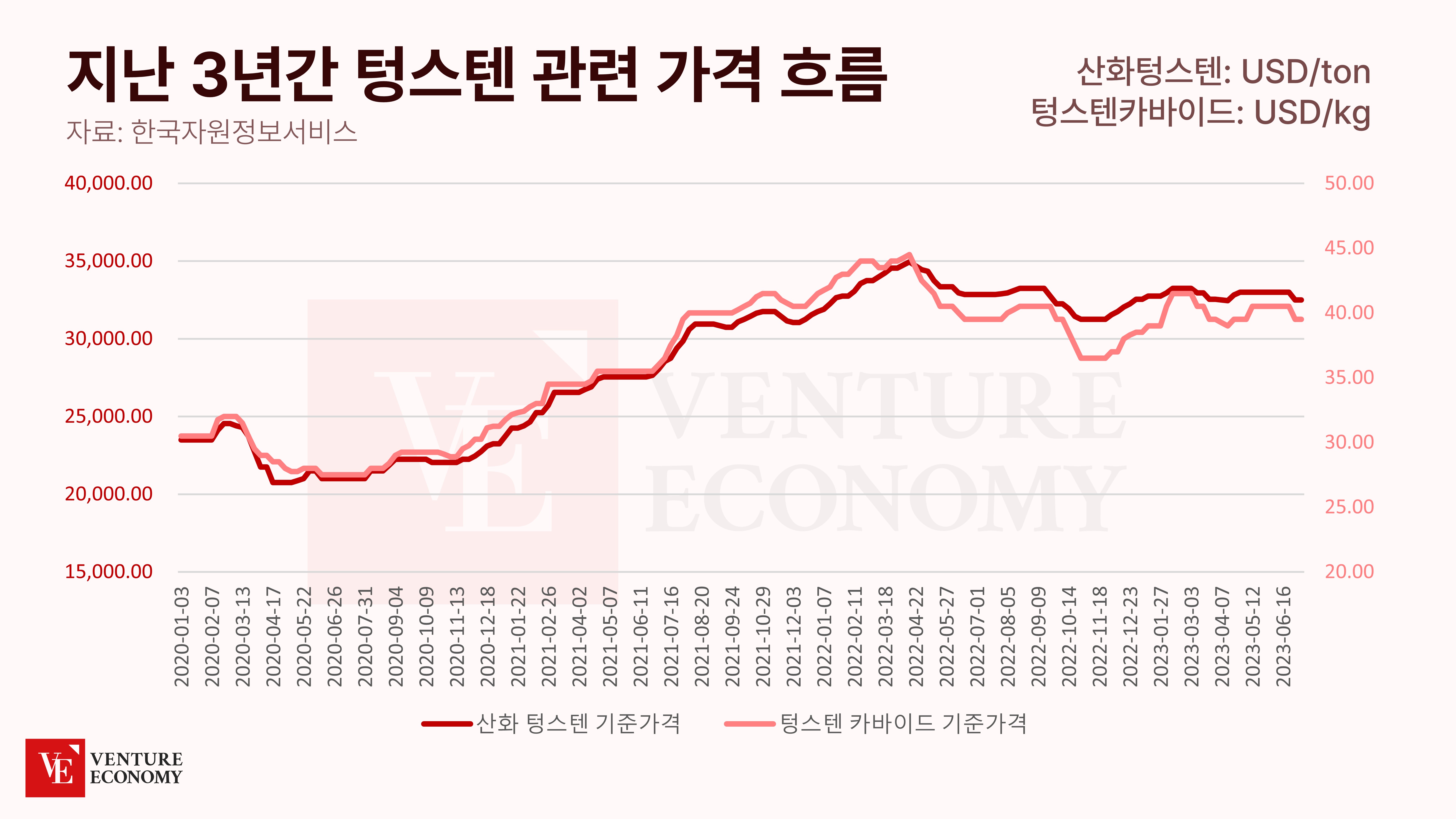 오늘날 중국은 전 세계 텅스텐 매장량의 60%를 보유하고 있으며 세계 수요의 약 82%를 공급하는 등 글로벌 텅스텐 산업을 확고히 장악하고 있다. 이로 인해 우리나라는 막대한 규모의 산화텅스텐 수급을 중국 수입에 의존할 수밖에 없는 형국이다. 대한무역투자진흥공사(코트라)에 따르면 한국의 텅스텐 대중 수입 비중은 2020년 98.3%, 2021년 92.6%, 2022년 82.9%다. 점차 감소하는 추세를 보이고 있지만 여전히 중국에 대한 의존도가 상당한 수준이다.