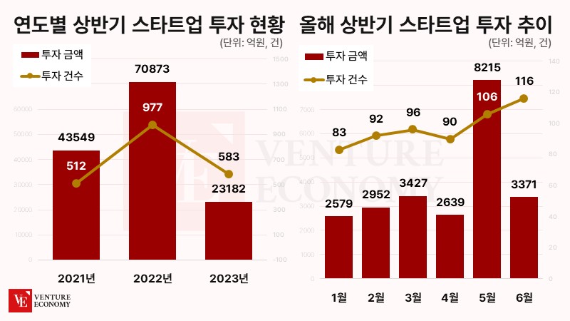 올해 상반기 국내 벤처·스타트업 투자액이 전년 동기 대비 급감한 것으로 나타났다. 글로벌 경기 둔화 및 고금리 기조에 벤처투자 시장 혹한기가 지속되면서 대규모 투자가 사라진 것이 주요 원인으로 꼽힌다. 일각에선 투자 건수가 2021년도보다 높게 나타났다는 점을 지적하며 시장의 혹한기가 정점을 지났다는 분석을 내놓고 있다.