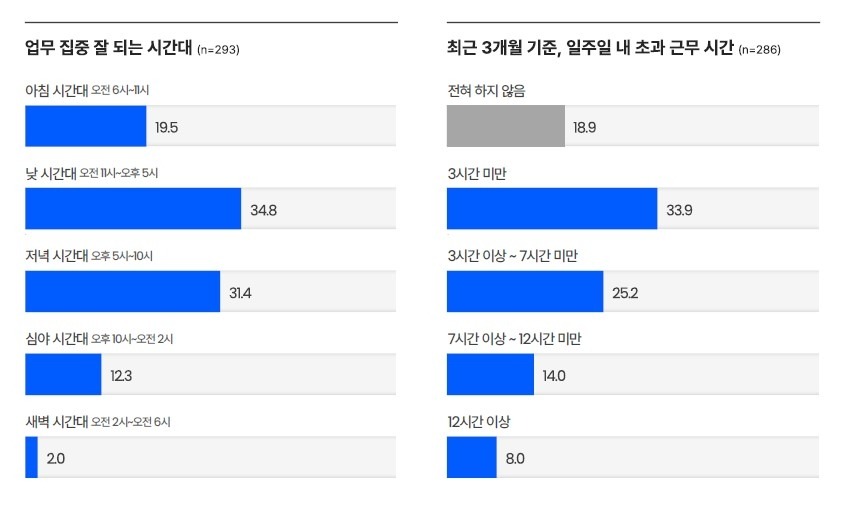 소비자 데이터 플랫폼 오픈서베이가 공개한 '개발자 트렌드 리포트 2022'에서도 이 같은 경향이 잘 드러난다. 리포트에 따르면 취업 상태인 개발자 286명 중 최근 3개월 안에 초과근무를 한 적 있다고 응답한 비율은 81.1%에 달했다. 일주일 기준 '3시간 미만' 초과근무한 비율은 33.9%였으며, 그 뒤를 '3~7시간' 25.2%, '7~12시간' 14%가 이었다. 일주일에 12시간 넘게 초과근무를 했다는 이들도 8%로 나타났다.