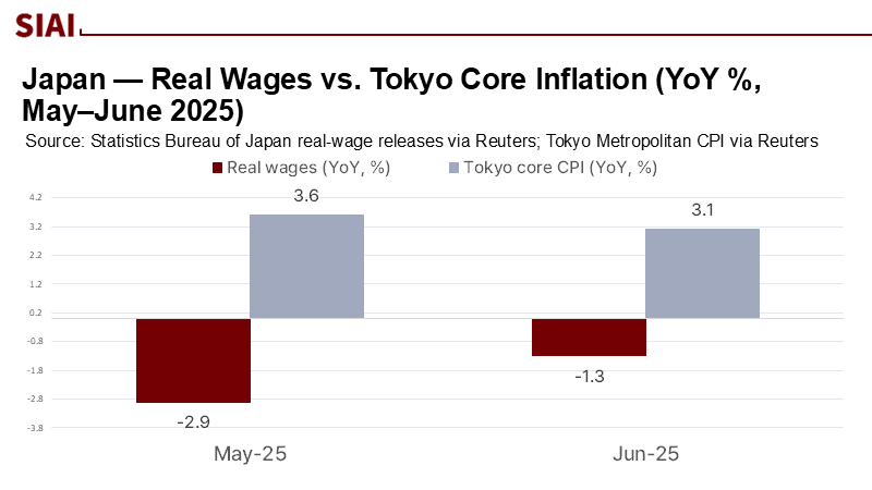 2025년 5월 실질임금은 전년 대비 2.9% 줄었고, 6월에도 1.3% 감소했다. 대기업 노조가 34년 만의 최대 폭인 평균 5.25%의 기본급 인상을 확보했지만, 구매력 개선으로 이어지지 못했다. 도쿄의 8월 근원물가 상승률은 2.5%로 둔화됐으나 목표치를 웃돌았고, 신선식품과 연료를 제외한 지표는 3% 상승했다. 보조금 효과에도 불구하고 생활 체감도는 개선되지 않았다. 엔화 가치가 달러당 160엔을 넘어서면서 정부가 개입했지만, 구매력 하락은 통계와 생활 현장에서 모두 확인됐다.