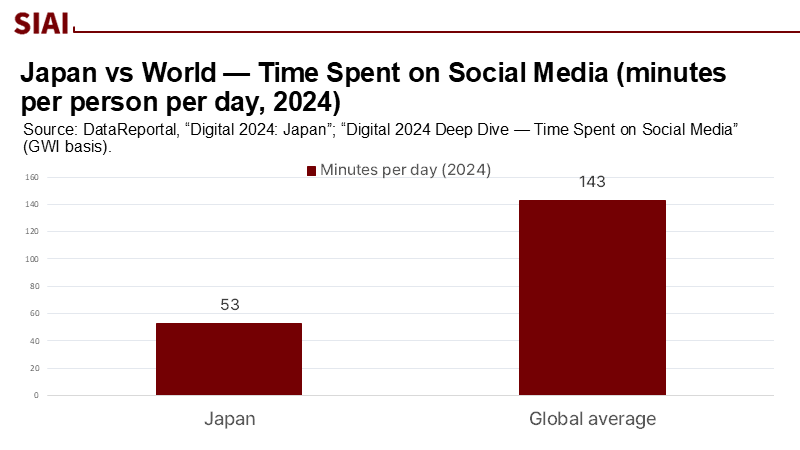 주: 지역-일본, 세계 평균(X축), 이용 시간(Y축)/일본은 세계 평균(143분)에 비해 소셜 미디어 사용 시간이 훨씬 적지만(53분), 높은 도달률 때문에 짧은 노출만으로도 정치적 메시지가 효과적으로 증폭됐다.