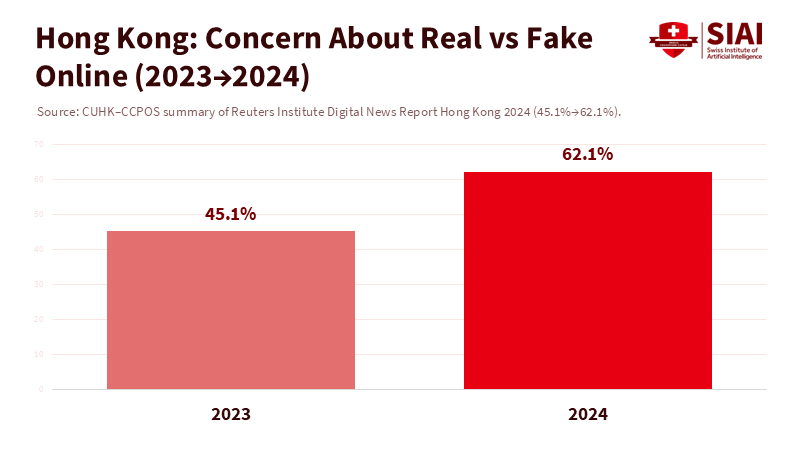 딥페이크로 인한 피해는 성적 학대에만 머물지 않는다. 온라인 정보 전반에 대한 신뢰가 무너지고 있다. 홍콩에서 ‘온라인 정보의 진위를 신뢰하기 어렵다’고 답한 비율은 2023년 45.1%에서 2024년 62.1%로 급등했다. 이러한 불신은 피해 신고의 신뢰도를 약화시키고, 루머 확산과 당국의 대응에도 직접적인 영향을 미친다.