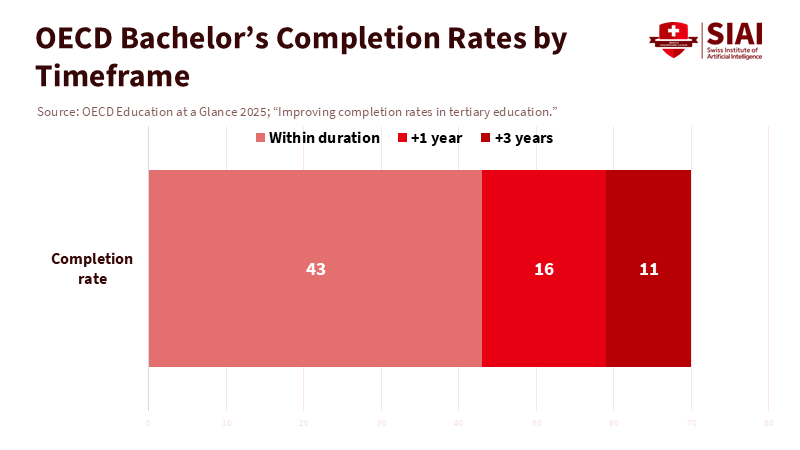 한때 고등교육은 ‘학위가 많을수록 성장과 기회가 커진다’라는 단순한 공식 위에 서 있었다. 그러나 이 공식만으로는 현실을 설명할 수 없다. OECD에 따르면 대학 학위의 개인적 수익률은 여전히 높지만, 졸업률은 낮고 학위 취득까지 걸리는 기간은 길다. 학사과정 학생 가운데 정해진 기간 내에 학위를 받는 비율은 43%에 불과하며, 몇 년을 더 주어도 70% 수준에 머문다.