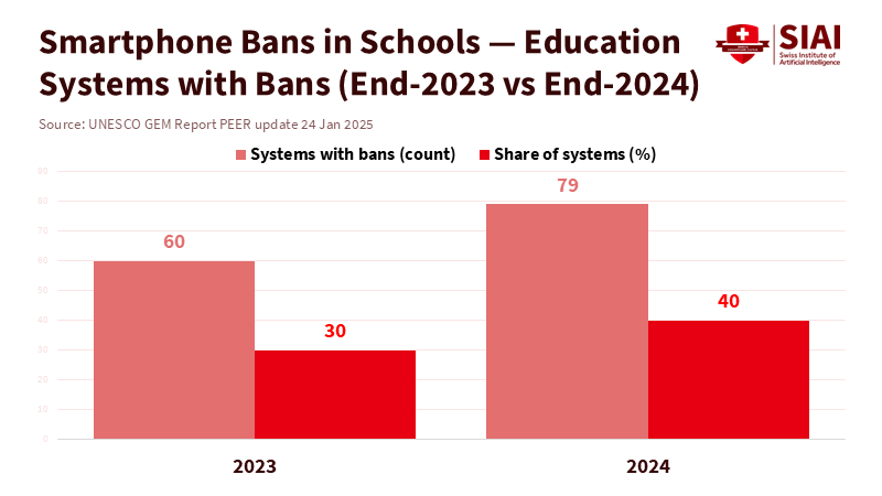주: 시점(X축), 금지 정책 현황(Y축)/스마트폰 사용 금지 정책을 시행 중인 국가 수(연한 빨강), 전체 조사 대상 중 금지 정책을 시행 중인 국가 비율(진한 빨강)