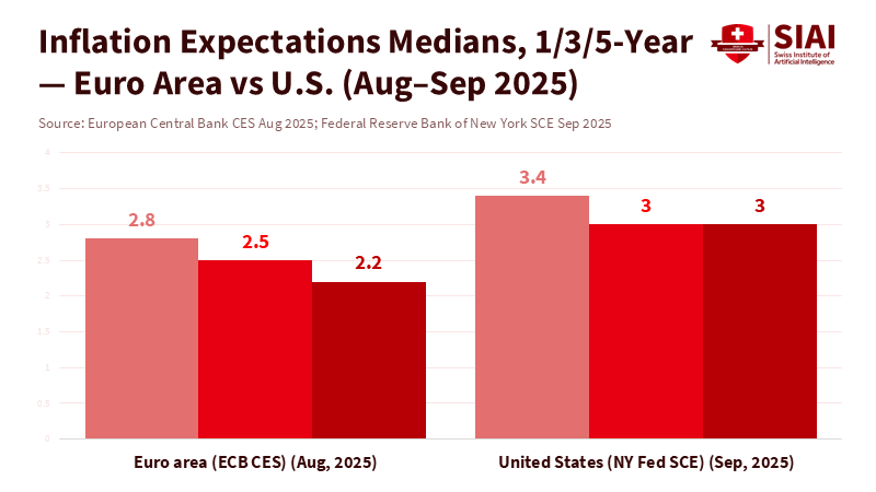 ECB가 2025년 8월 실시한 소비자 조사에 따르면, 유로존의 1년 후 인플레이션 기대는 2.8%, 3년 후 2.5%, 5년 후 2.2%로 나타났다. 단기 기대는 목표를 웃돌았지만, 중장기 기대는 안정적이었다. 단순하고 반복된 메시지가 신뢰를 붙잡는 역할을 한 것이다.