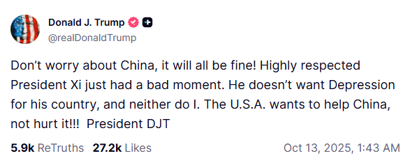 12일(이하 현지시간) 트럼프 대통령은 자신의 소셜미디어(SNS) 트루스소셜을 통해 “그(시진핑 주석)는 중국이 불황에 빠지는 걸 원치 않는다. 나도 마찬가지”라고 적었다. 또 “중국에 대해 걱정하지 마라. 다 잘될 것”이라며 “존경받는 시진핑 주석이 잠깐 안 좋은 순간을 겪은 것뿐”이라고 말했다. 중국의 희토류 수출 통제를 언급한 것으로, 시 주석이 ‘안 좋은 순간’에서 벗어나면 협상에 나설 수 있다는 뜻으로 해석된다.